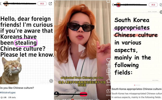19일까지 샤오홍슈에는 “한국인들이 중국 전통문화를 상당 부분 훔치는 것에 대해 외국 친구들은 어떻게 생각하는가” “한국은 베끼기만 하는 게 아니라 훔치기도 한다” “베트남과 한국이 문화적으로 우리의 춘절(중국의 음력설)을 훔쳐가려고 시도하는데 아주 질렸다” 등의 게시물이 게재됐다.