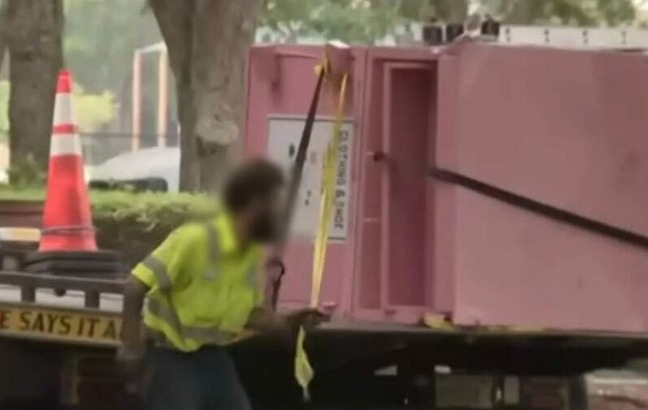 여성 노숙자가 갇혀 숨진 헌옷 수거함이 옮겨지고 있는 모습.CBS 마이애미방송 캡처