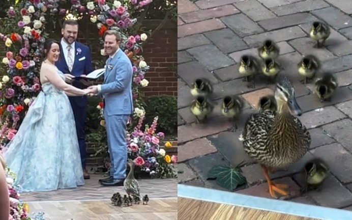 현장에 있던 이벤트 프로듀서에 따르면, 신부가 행진을 마치고 신랑 옆에 도착한 뒤, 오리 가족이 갑자기 예식장 통로로 줄지어 걸어 들어왔다.