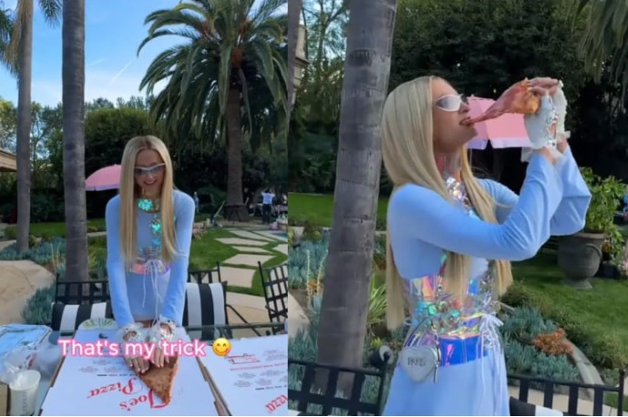 최근 패리스 힐튼은 틱톡에 피자 먹는 영상을 올렸다. 영상을 보면 힐튼은 피자를 박스에 올려놓고 꾹꾹 누르고 있다.피자가 떨어진 자리엔 기름진 자국이 남아있다. 빵 부분이 아니라 토핑이 있는 쪽을 박스에 접촉했기 때문이다.