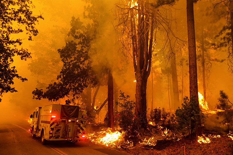 23일 캘리포니아주 요세미티 국립공원 인근 마리포사 카운티에서 ‘오크 파이어’로 명명된 산불이 맹렬히 타오르고 있다. 요세미티 국립공원 인근에서 전날 발생한 작은 산불이 이날 초대형 산불로 확산하면서 주민 6천여 명에게 대피령이 내려졌다. [로이터=사진제공]