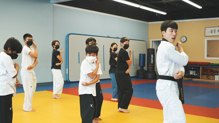 박성영 대표(맨 오른쪽)가 플레즌튼 소재 MACH 마샬아츠 태권도장에서 학생들에게 태권무를 가르치고 있다. <사진 아르태>