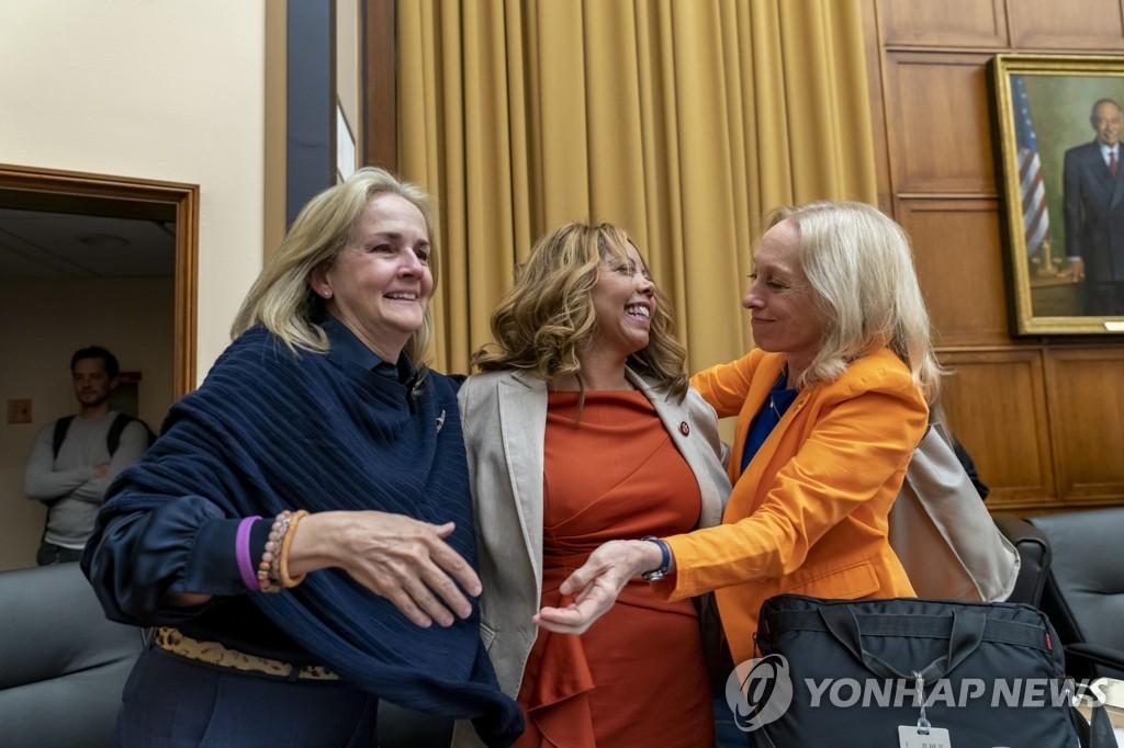 2일 워싱턴DC 연방 의사당에서 열린 하원 법사위원회에서 총기 구매 가능 연령을 18세에서 21세로 올리는 이른바 '우리 아이 지킴이'(Protecting Our Kids) 법안이 통과되자 매들린 딘(왼쪽부터)·루시 맥배스, 메리 게이 스캔런 등 민주당 소속 하원의원들이 기뻐하고 있다. 이 법안은 민주당이 다수당인 하원에서는 통과가 가능하지만 민주·공화 의원 동수인 상원에서는 최소 10명의 공화당 의원 동참이 필요해 통과가 어려울 전망이다.