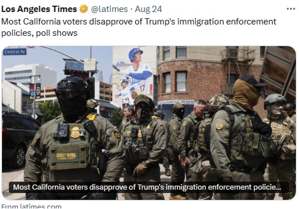 최근 발표된 새로운 여론조사 결과에 따르면 대다수의 캘리포니아 유권자들은 트럼프 행정부의 이민 단속 정책에 반대하며, 이민 단속이 라티노를 부당하게 표적삼고 있다고 믿는 것으로 나타났다.