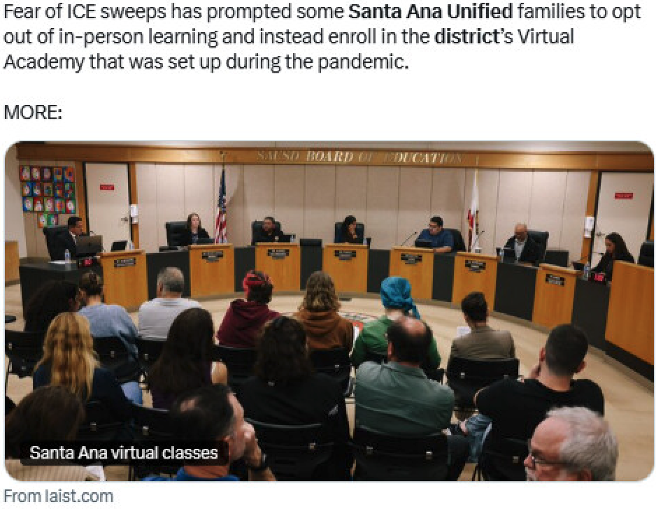 연방이민세관단속국, ICE의 급습에 대한 두려움이 커지면서, 오렌지카운티 산타애나 통합교육구(SAUSD) 학부모들 중에 대면수업이 아니라 온라인 가상수업(버추얼 아카데미·SAVA)에 자녀를 등록하는 사례가 갈수록 더 증가하고 있는 것으로 나타났다.
