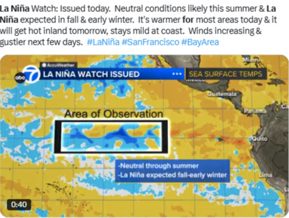레이첼 케네디 국립기상청(NWS) 소속 기상학자는 일반적으로 라니냐에 본격적으로 들어가는 시기를 맞게 되면 북가주와 태평양 북서부 지역이 평년보다 습해지게 된다고 설명했다.