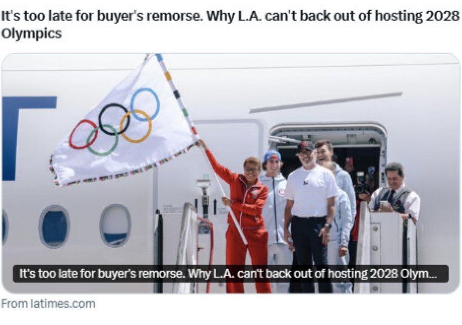 LA Times는 어제(8월18일) 기사에서 이제 올림픽을 철회하기에는 너무 늦었다고 보도했다.