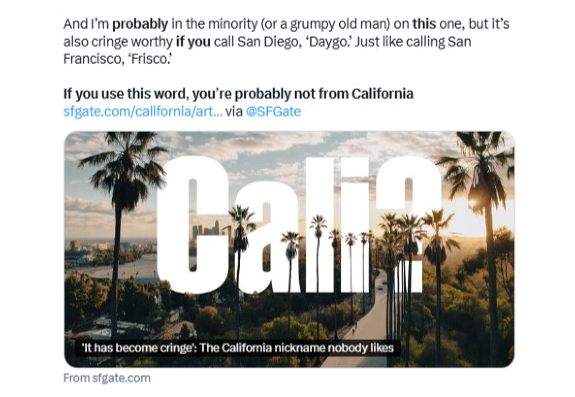 토박이 캘리포니아 사람들은 ‘Cali’라는 말 자체를 쓰지 않고, 쓰는 사람이 있으면 주변에서 민망하게 쳐다본다는 댓글이 대표적이다.