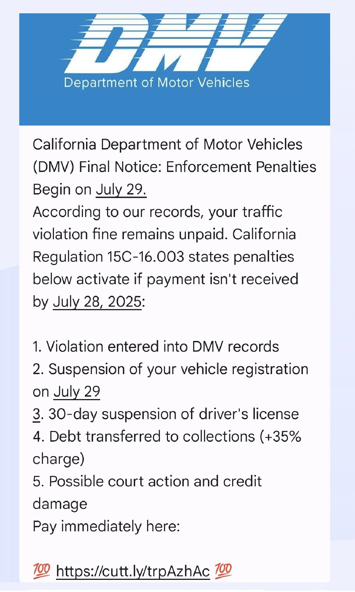 또 문자에는 DMV 공식 마크가 함께 나와있는 경우가 있기 때문에 주민들은 공식 기관에서 보낸 것으로 착각할 수도 있습니다.