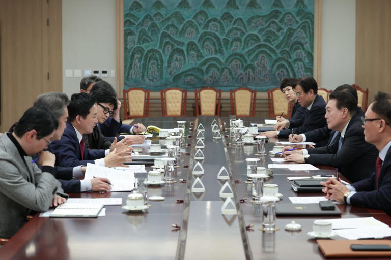 윤석열 대통령이 21일 서울 용산 대통령실 청사에서 한동훈 법무부·원희룡 국토부 장관, 윤희근 경찰청장, 권기섭 노동부 차관 등으로부터 건설현장 폭력 현황과 실태를 보고받고 있다. © 제공: 파이낸셜뉴스