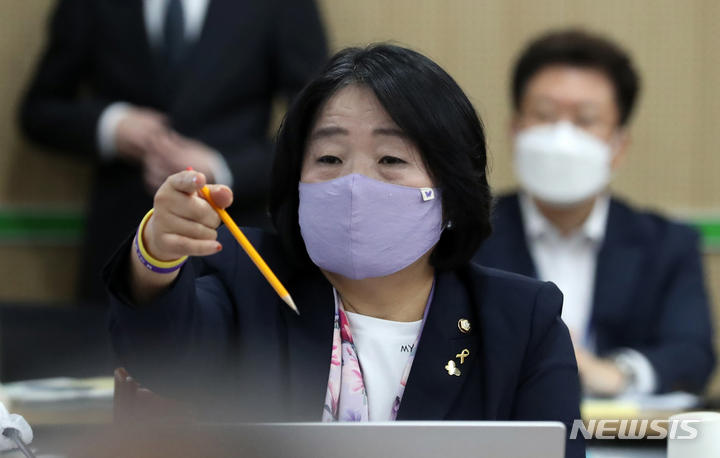 [세종=뉴시스] 강종민 기자 = 윤미향 무소속 의원이 지난해 10월14일 세종시 국립세종수목원에서 열린 국회 농림축산식품해양수산위원회의 산림청 등에 대한 국정감사에서 모니터를 가르키고 있다. 2022.10.14.