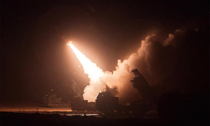 북한이 지난 6월 5일 단거리 탄도 미사일 8발을 쏘는 도발을 하자 한미 연합군이 지난 6월 6일 지대지 미사일 8발을 시험 발사했다. 합동참모본부는 지난 6월 6일 오전 "한미 동맹은 오늘 4시45분경부터 북한의 다수의 탄도 미사일(SRBM) 도발에 대한 대응으로 연합 지대지미사일 ATACMS(에이태킴스) 8발을 동해상으로 사격했다"고 밝혔다. 8발 중 한국군이 7발, 미군이 1발을 발사했다. 사진은 한미 에이태킴스 지대지 미사일 발사 장면. 합동참모본부 제공 © 제공: 세계일보
