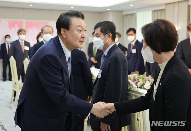 [서울=뉴시스] 전신 기자 = 윤석열 대통령이 14일 서울 용산 대통령실 청사에서 열린 반도체산업 경쟁력 강화 특위 초청 오찬 간담회에서 참석자들과 인사하고 있다.(대통령실통신사진기자단) 2022.09.14.