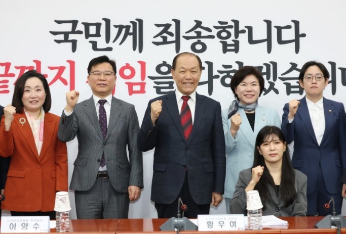 황우여 국민의힘 선관위원장과 위원들이 9일 오전 서울 여의도 국회에 열린 선거관리위원회 첫 회의에서 기념촬영을 하고 있다. 2025.4.9/뉴스1