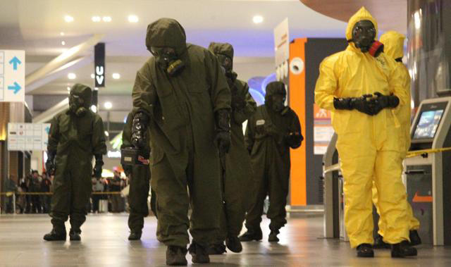 2017년 2월 김정은 북한 국무위원장의 이복형 김정남이 맹독성 신경작용제 VX 공격을 받고 사망한 말레이시아 쿠알라룸푸르 국제공항2에서 말레이 당국이 독극물 제거작업을 진행하는 모습. 쿠알라룸푸르=연합뉴스