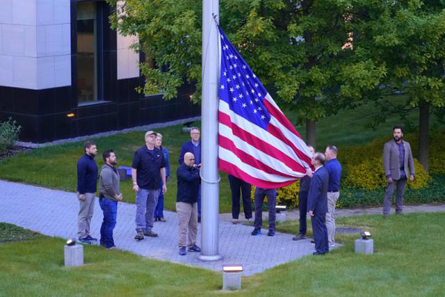 [우크라이나 수도 키이우의 미국 대사관에서 지난 5월 18일 대사관 직원들이 성조기를 게양하고 있다. 키이우=AP 연합뉴스]