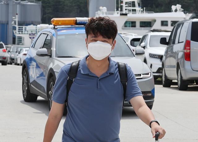 국민의힘 이준석 대표가 27일 경북 울릉군 사동항 여객터미널에서 선박 탑승을 위해 이동하고 있다. 연합뉴스