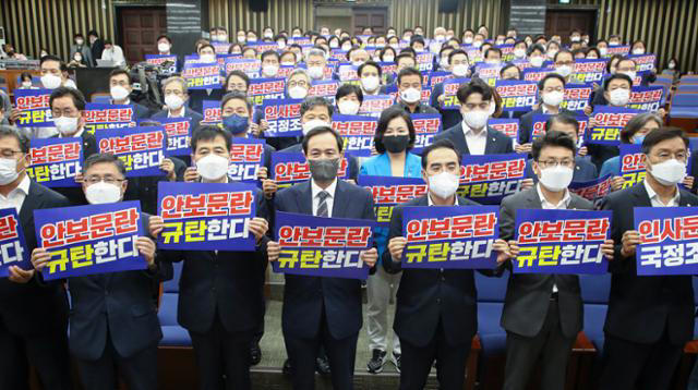 19일 서울 여의도 국회에서 열린 더불어민주당 의원총회에서 우상호 비상대책위원장, 박홍근 원내대표와 의원들이 '안보문란 규탄한다' 피켓을 들고 구호를 외치고 있다. 연합뉴스