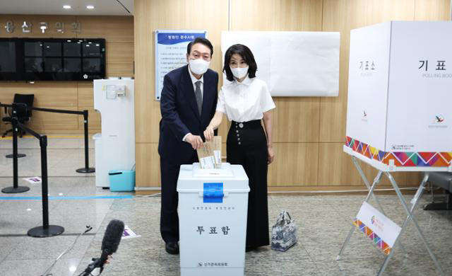 윤석열 대통령과 부인 김건희 여사가 27일 서울 용산구의회에 마련된 제8회 전국동시지방선거·국회의원 보궐선거 사전투표소에서 한 표를 행사하고 있다. 서재훈 기자