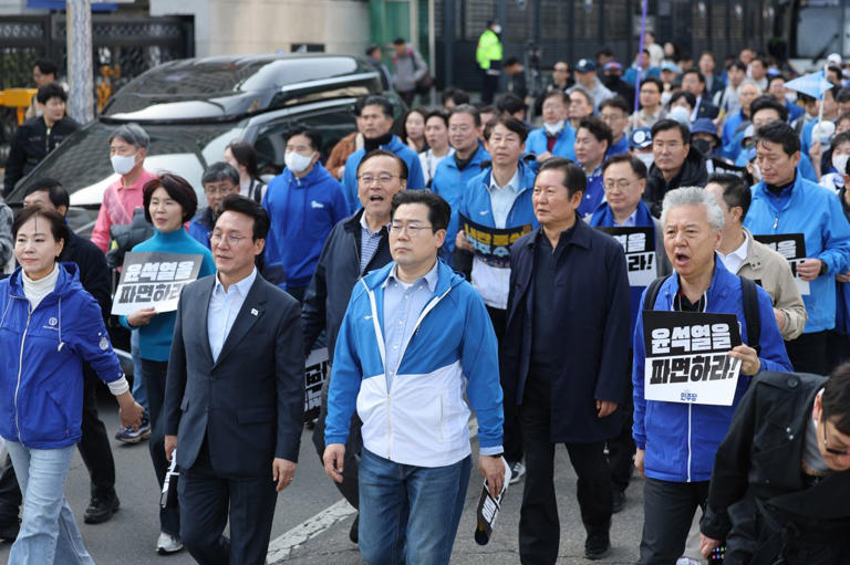 더불어민주당 박찬대 원내대표 및 의원들이 15일 국회에서 윤석열 대통령 파면 촉구 도보 행진을 시작해