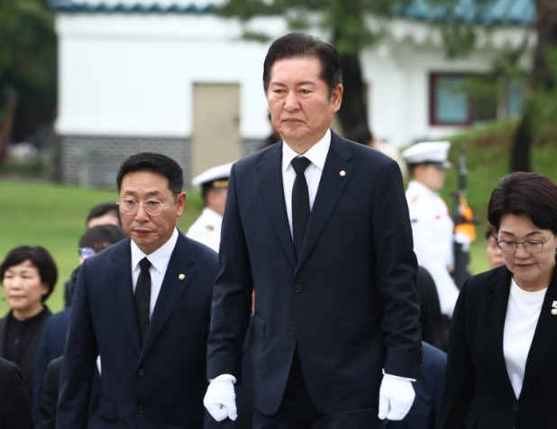 더불어민주당 당대표 출마를 선언한 정청래 의원이 16일 오전 서울 동작구 국립서울현충원에서 현충탑에 참배하기 위해 이동하고 있다. 뉴스1