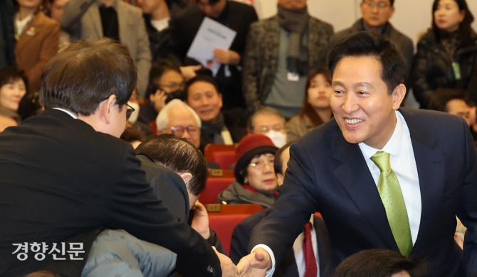 토론회에는 권영세 비상대책위원장과 권성동 원내대표 등 국민의힘 지도부를 포함해 48명의 현직 의원이 참석했다. 여당 소속 의원(108명)의 절반에 가까운 수치다. 오 시장 지지자들이 대거 모여들어 토론회장은 대선 캠프 출정식을 방불케 했다.