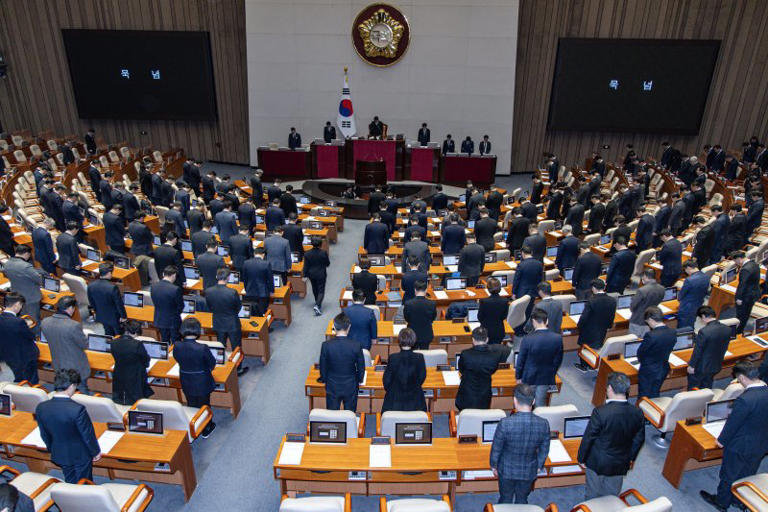 우원식 국회의장을 비롯한 여야 의원들이31일 오후 서울 여의도 국회 본회의장에서 열린 제420회 국회(임시회) 제3차 본회의에서