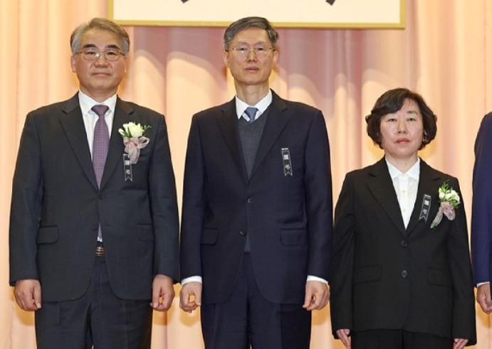2일 오전 서울 종로구 헌법재판소에서 열린 헌법재판관 취임 및 시무식에서 정계선(오른쪽), 조한창(왼쪽) 신임 헌법재판관과