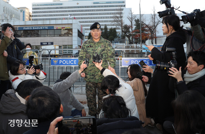 언론 앞에 선 707특임단장 비상계엄 당시 국회에 투입된 부대를 지휘한 김현태 707특수임무단장이 9일 서울 용산구 전쟁기념관 앞에서
