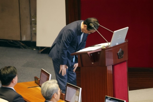 국회 본회의에서 허리 숙여 사과한 한덕수 국무총리. 연합뉴스