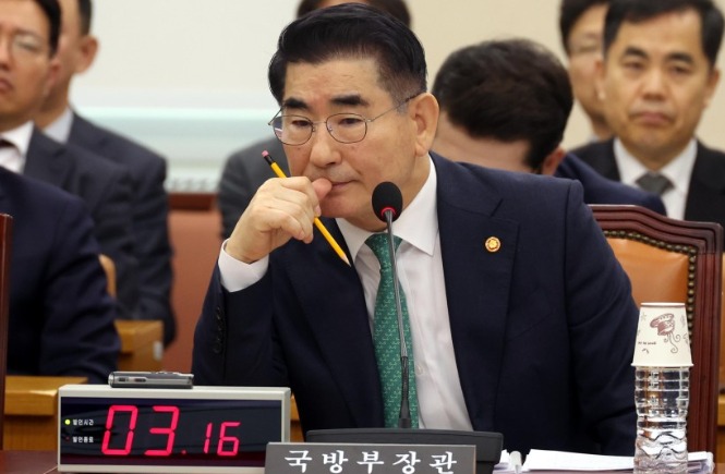김용현 국방부 장관이 15일 오전 서울 여의도 국회에서 열린 국방위원회 전체회의에서 추미애 더불어민주당 의원이 준비한
