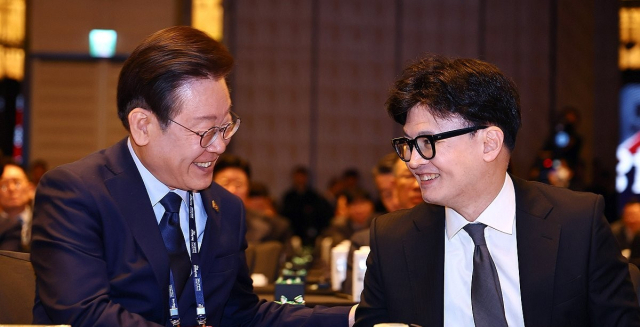 국민의힘 한동훈 대표(오른쪽)와 더불어민주당 이재명 대표가 23일 오전 서울 포시즌스 호텔에서 열린 중앙포럼에서 대화하고 있다. 연합뉴스 |