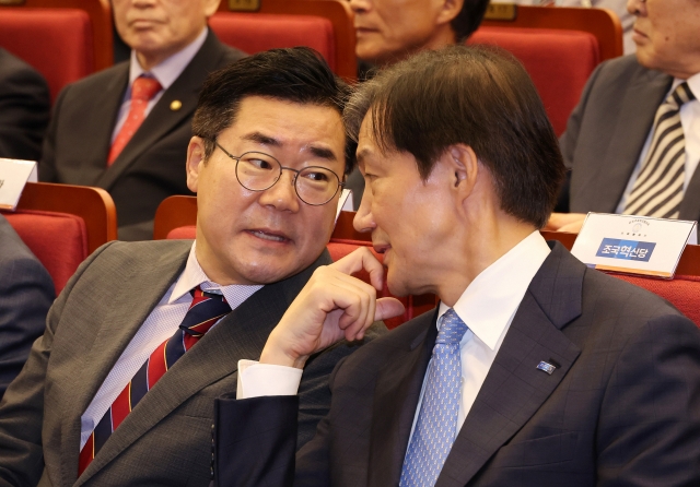 박찬대 더불어민주당 원내대표와 조국 조국혁신당 대표(오른쪽)가 지난 26일 오전 서울 여의도 국회도서관에서 열린