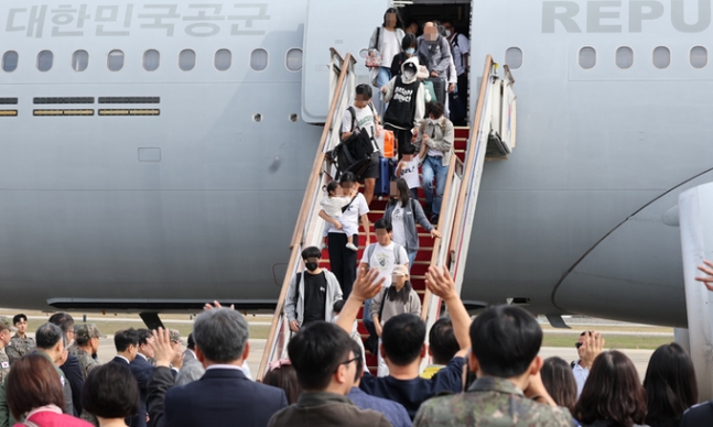 무장단체 헤즈볼라를 상대로 한 이스라엘의 지상작전이 진행 중인 레바논 체류 국민들이 5일 서울공항에 도착한 군수송기에서 내리고 있다. 뉴시스