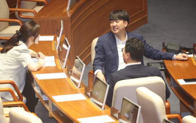 개혁신당의 이준석 의원이 19일 국회에서 열린 본회의에서 천하람·이주영 의원과 대화하고 있다. 연합뉴스