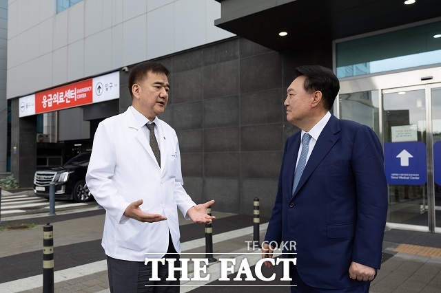 윤석열 대통령이 13일 서울 중랑구 서울의료원 권역응급의료센터를 방문해 이현석 원장과 대화하고 있다. /뉴시스