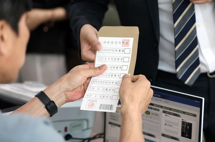 제21대 대통령 사전투표 첫날인 지난 29일 광주 동구 서남동 사전투표소에서 선거사무원이 유권자에게 투표 용지를 건네고 있다. /뉴스1