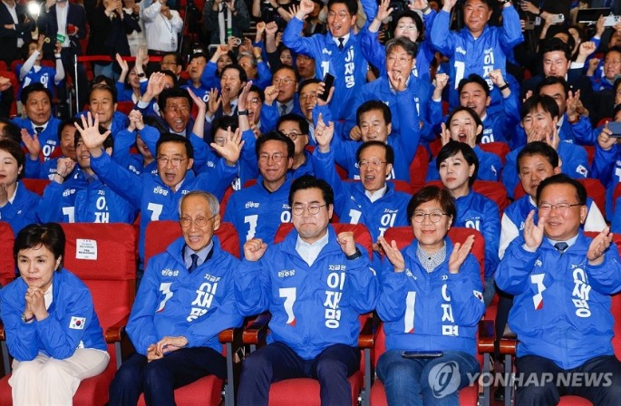 더불어민주당은 3일 21대 대통령 선거에서 이재명 후보의 득표율이 50%를 넘긴다는 지상파 3사 출구조사 결과가 발표되자 환호와 박수를 보냈다.