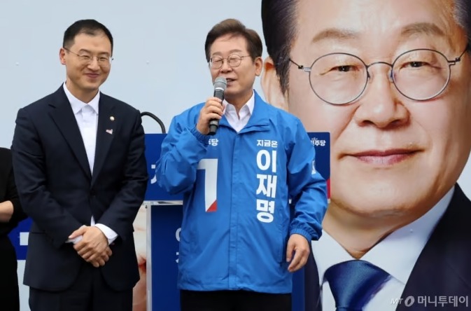 이재명 더불어민주당 대선 후보가 국민의힘에서 탈당한 무소속 김상욱 의원을 유세 현장에서 만나 "이분이 합리적인 보수의 가치를 민주당 안에서 실현할 수 있도록 우리가 도와주면 좋겠다"고 밝혔다.