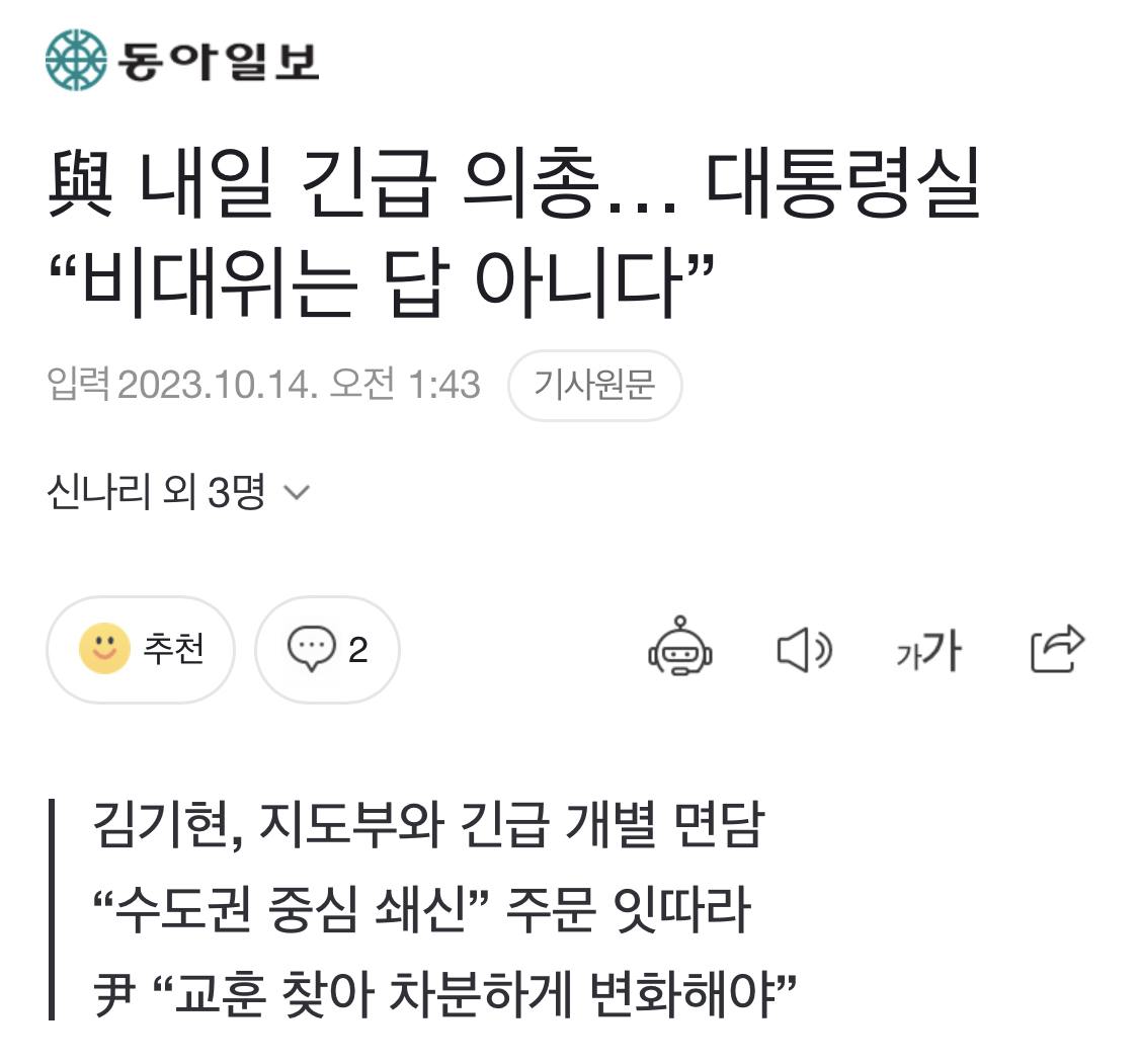 與 내일 긴급 의총… 대통령실 “비대위는 답 아니다”